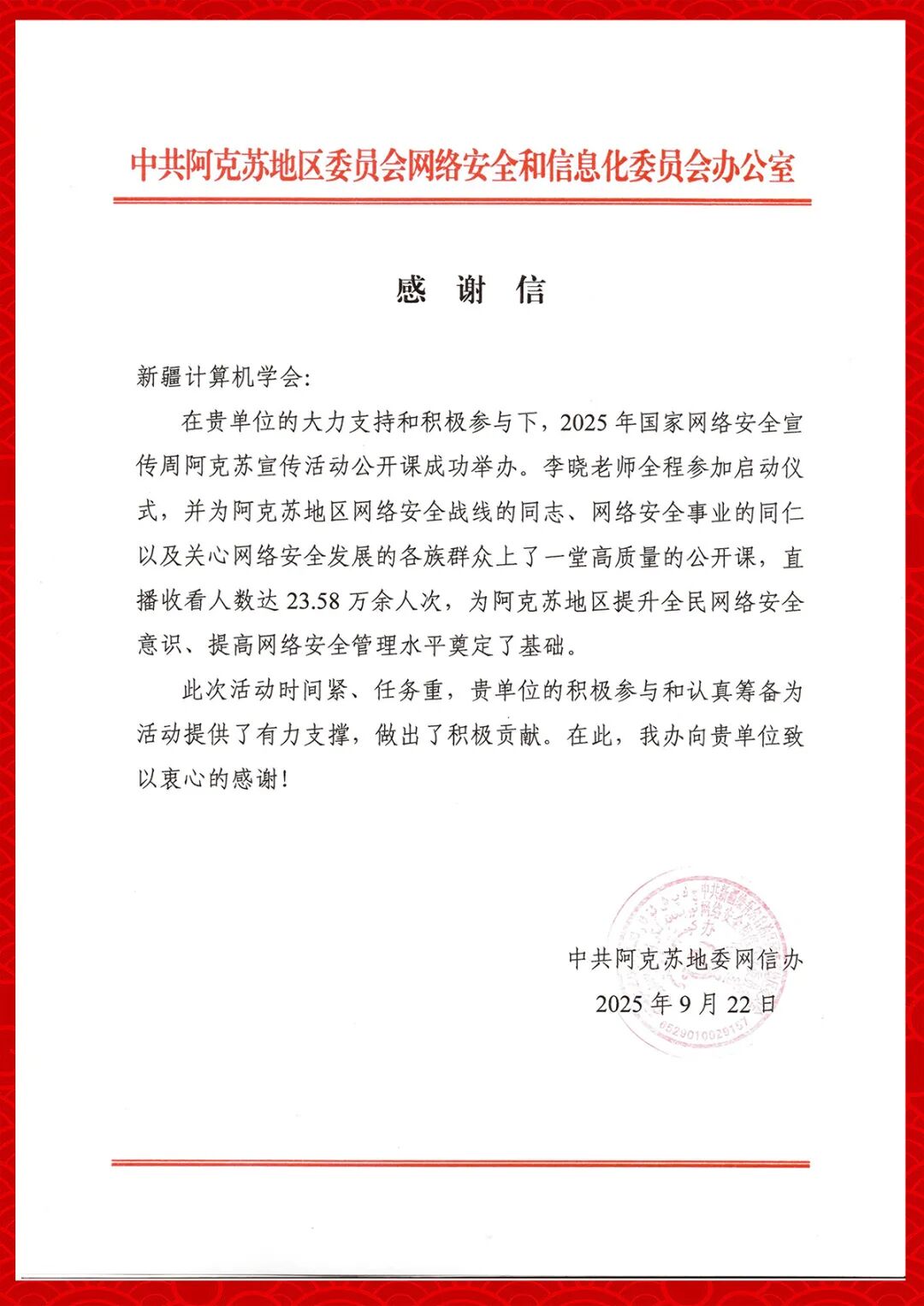 9月22日,新疆计算机学会将 “AI 科普” 与网络安全主题深度结合,走进 2025年国家网络安全宣传周阿克苏温宿县活动现场。李晓理事长以“人工智能时代的网络安全挑战与应对” 为主题,为在场各行业代表带来专题科普,助力提升基层从业者的网络安全意识与个人信息保护能力。
