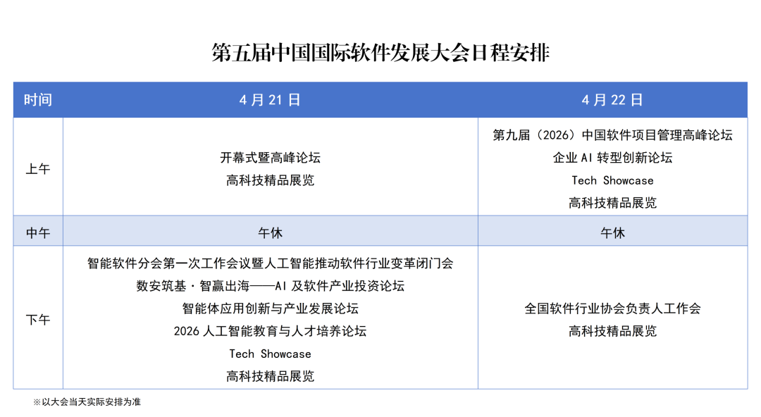 作为软件产业领域最具权威性与前瞻性的国际交流平台之一,第五届中国国际软件发展大会将于2026年4月21日至22日在北京国家会议中心隆重举行。本届大会以“人工智能与软件变革——AI融合与数智出海新机遇”为主题,通过“开幕式+高峰论坛+平行论坛+闭门会议+展览展示”的丰富形式,全面展现中国软件产业在智能时代的新动能、新生态与新机遇。自2022年首届大会创办以来,这一盛会已成功举办四届,品牌影响力持续提升,成为推动软件产业高质量发展的重要力量。值此第五届大会即将启幕之际,大会组委会正式发布大会日程安排,诚邀软件从业者、企业领袖、专家学者及各界伙伴共赴这场年度行业盛会!